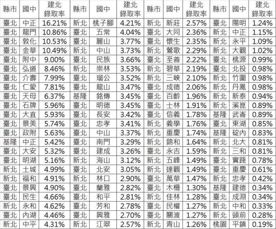 最近在網路上流傳一份「111年公立國中升建中/北一女錄取率」名單,這資料主要將北北基(台北、新北、基隆)三縣市考取建中與北一女的比例列出。但2023年4月時台北市教育局副局長陳素慧有回應,教育局從未公布類似資料,所以不清楚該份資料的真實性,也無法確定來源是否透過逐一向國中查證,建議家長切勿輕信。