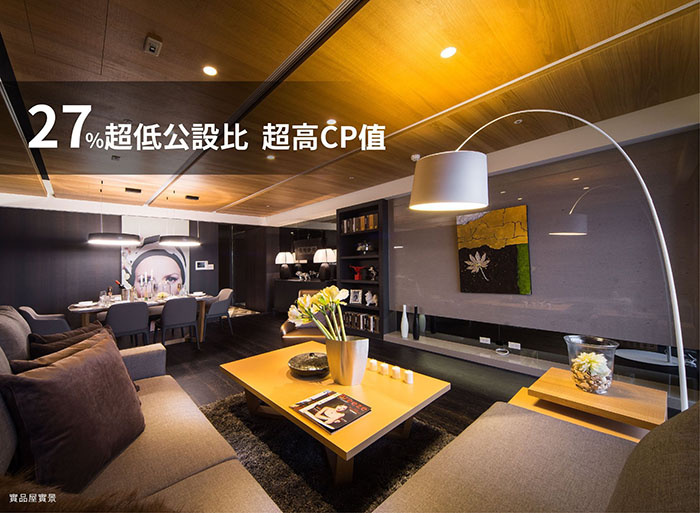 房屋以低公設比為其特色,雨遮同樣不計坪數,以公設27%為例,同樣56坪的房型就會比其它35%的建案多出了近4坪的室內面積(幾乎多了一間房),坪效值超高。