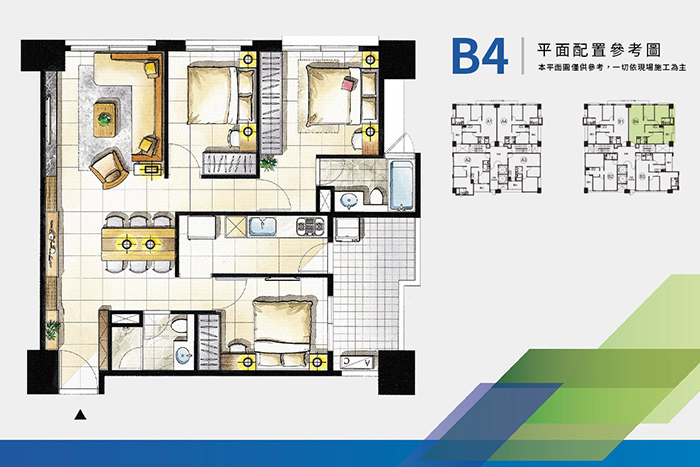 公設比約32%,以33坪的3房樣品屋為例,提供3房2廳2衛,還有一個陽台,且3房是正3房,臥室皆有獨立對外窗。