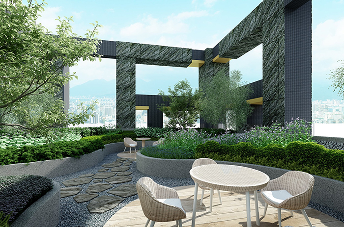 在23層上面的頂樓則規劃了屋頂綠覆,等於自己社區有一個空中花園,天氣好時還可遠望101大樓。