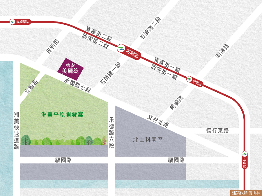 ◆主幹道環繞:承德路、文林路直上洲美快速道路,約20分鐘抵達市中心,串聯士林、天母、北投生活圈。